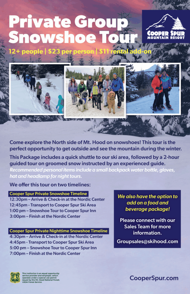Come explore the beauty of Mt. Hood on a full snowshoe adventure. You might even catch a glimpse of the alpenglow! The tour starts with a quick shuttle to our ski area for an exclusive ride up the Homestead chairlift. On groomed snow, the tour winds its way into the Mt. Hood National Forest under a canopy of Douglas Fir and Hemlock trees. Finish the evening with a cozy dinner in our farm to table Crooked Tree Restaurant. Your winter adventure awaits!