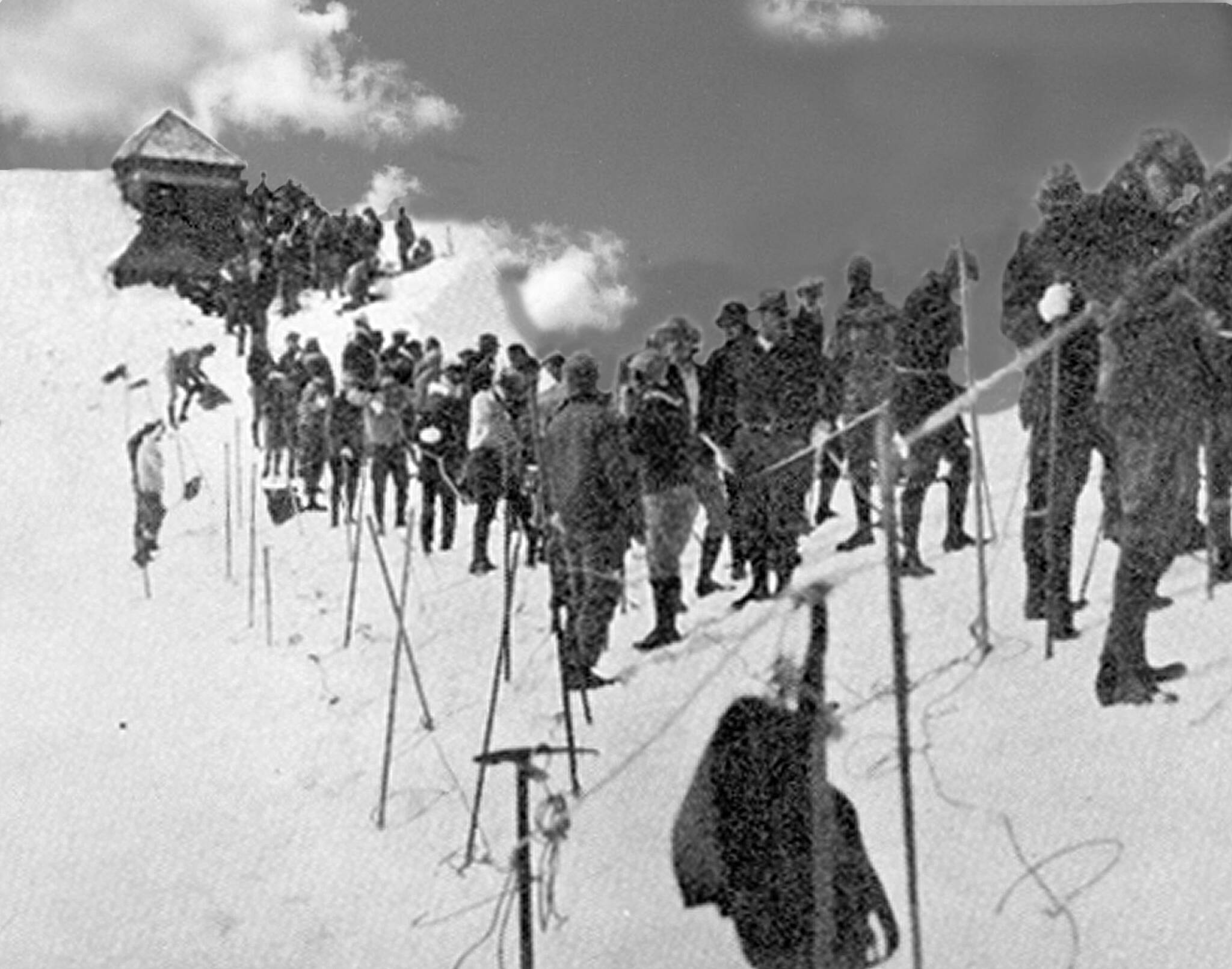 In 1927 the Hood River Ski Club cleared and built a ski jump on the steep hill (known as “Jump Hill” to the left of the chairlift (as you ride up). The tow motor was on the center of the hill, with tow rope running both above and below the lift shack, an unusual arrangement. It was somewhat underpowered. Too many skiers holding onto the rope all at once could halt the tow. The shack was removed in 1955 when the tow was lengthened, and the equipment was used to make a second tow.